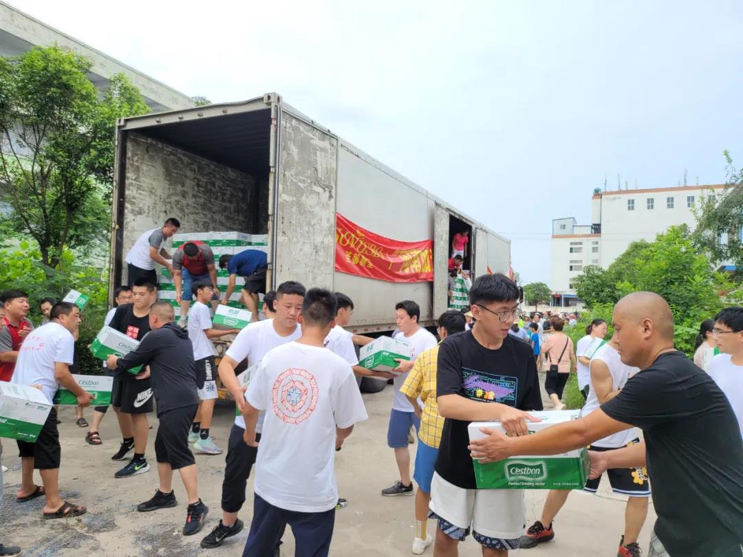 一辆满载纯净水和食品等抗洪救灾物资的卡车,